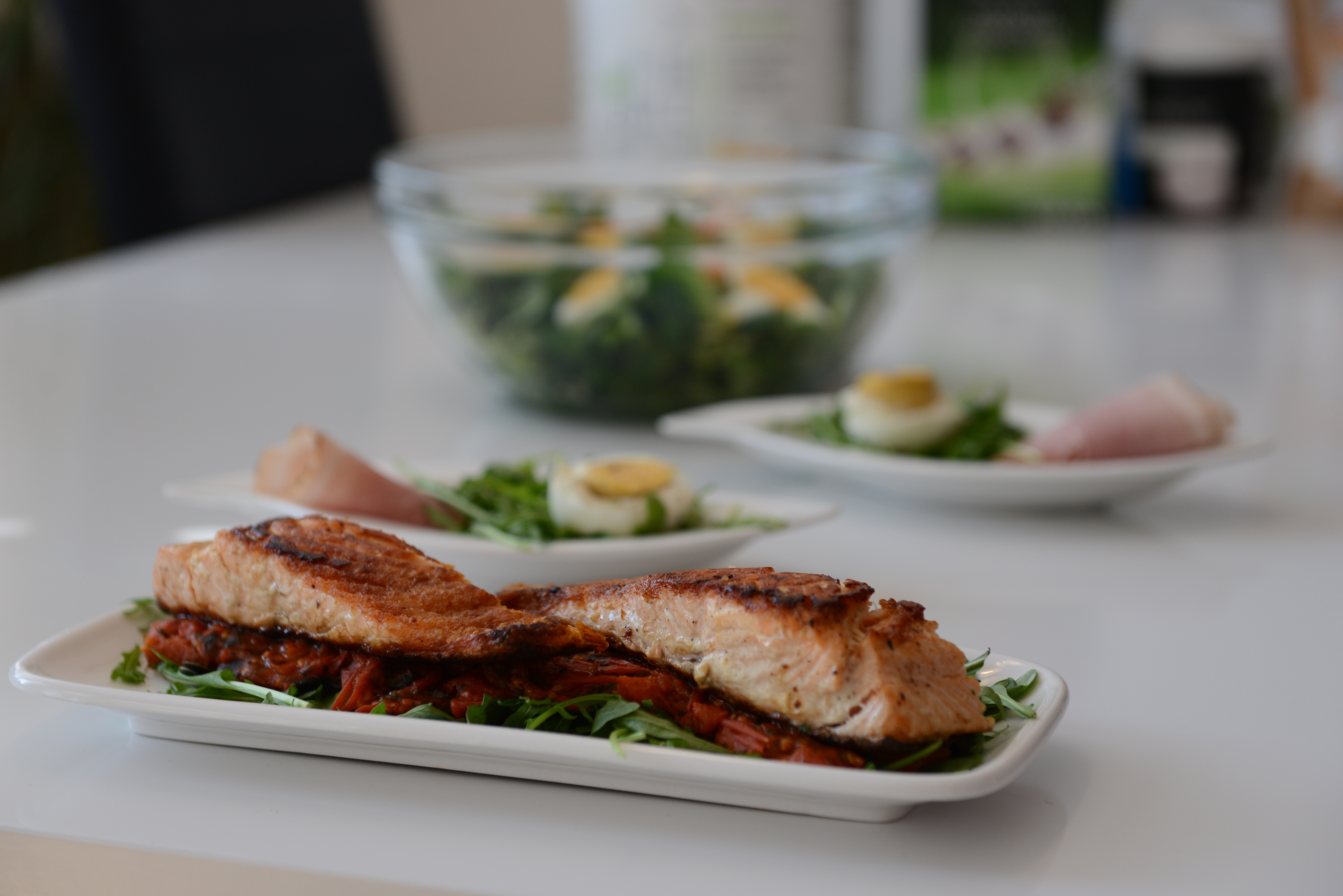 Se servirnem krožniku pripravimo »posteljico« za lososa: najprej damo na krožnik rukolo ter čez njo nadevamo pražen paradižnik. Na tako pripravljeno posteljico položimo lososa in takoj ponudimo.